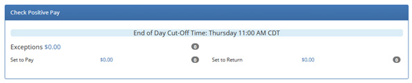 On the main screen of Positive Pay HQ, in the Check Positive Pay box, click on the Exceptions dollar amount. If the amount is $0.00, there are no exceptions to review.